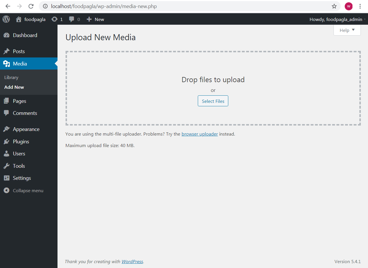 ওয়ার্ডপ্রেস এর Media মেন্যুর দ্বিতীয় সাব-মেন্যুটি হল Add New সাব-মেন্যু। ওয়েব ব্রাউজারের http://localhost/foodpagla/wp-admin/media-new.php লিংকে গিয়েও Media মেন্যুর Add New সাব-মেন্যুটি চালু করা যায়। এখানে ওয়েবসাইট বা ব্লগে ব্যবহার করার জন্য মিডিয়া ফাইল গুলো upload করা হয়। এখান থেকে ছবি বা মিডিয়া ফাইল গুলো সম্পাদনা বা edit করা যায় না, কেবল মিডিয়া লাইব্রেরীতে যোগ করা যায়।